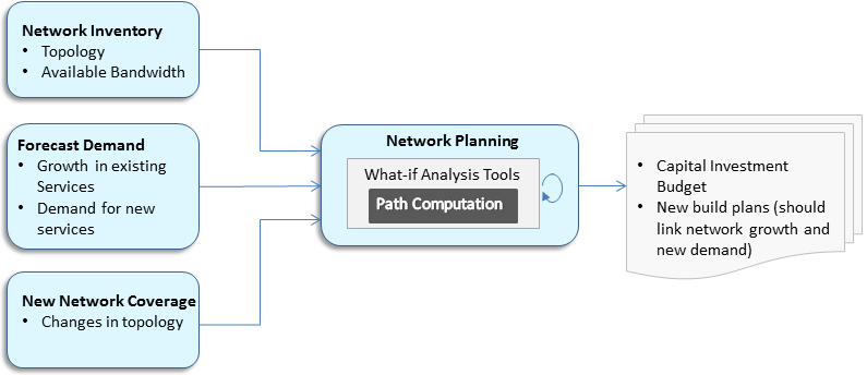 Network Planning goal is to develop capital budget and future state of the network. Activities such as capacity planning, design and deployment of new technologies and expansion of network coverage are part of network planning. Effective what-if analysis by modeling network scenarios provides insight into decision choices. Tools with path computation allow planners to build cost effective solutions and help build business cases for network expansion projects. Access to data about current network state, forecast and market assumptions are supported by systems and processes that are also subject of standards, such as TMF Frameworx. Figure 1 shows a high-level view of sources/types of inputs and outputs of the process